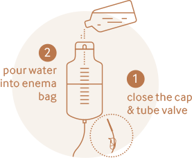 Close the cap at the tube end, close the tube valve, then pour agent-recommended volume of clean room temperature water into the enema bag.